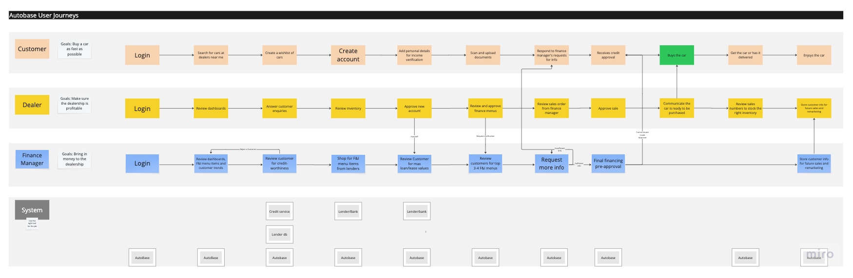 With three distinct user types identified (Customer, Car Dealer, and Finance Manager), we designed tailored interfaces for each: a mobile app for customers and a web platform for dealers and finance managers. The workflow prioritises the finance manager’s role, after customers submit their details through the mobile app, finance managers verify information and configure 3-4 personalised finance options based on the customer’s credit profile.