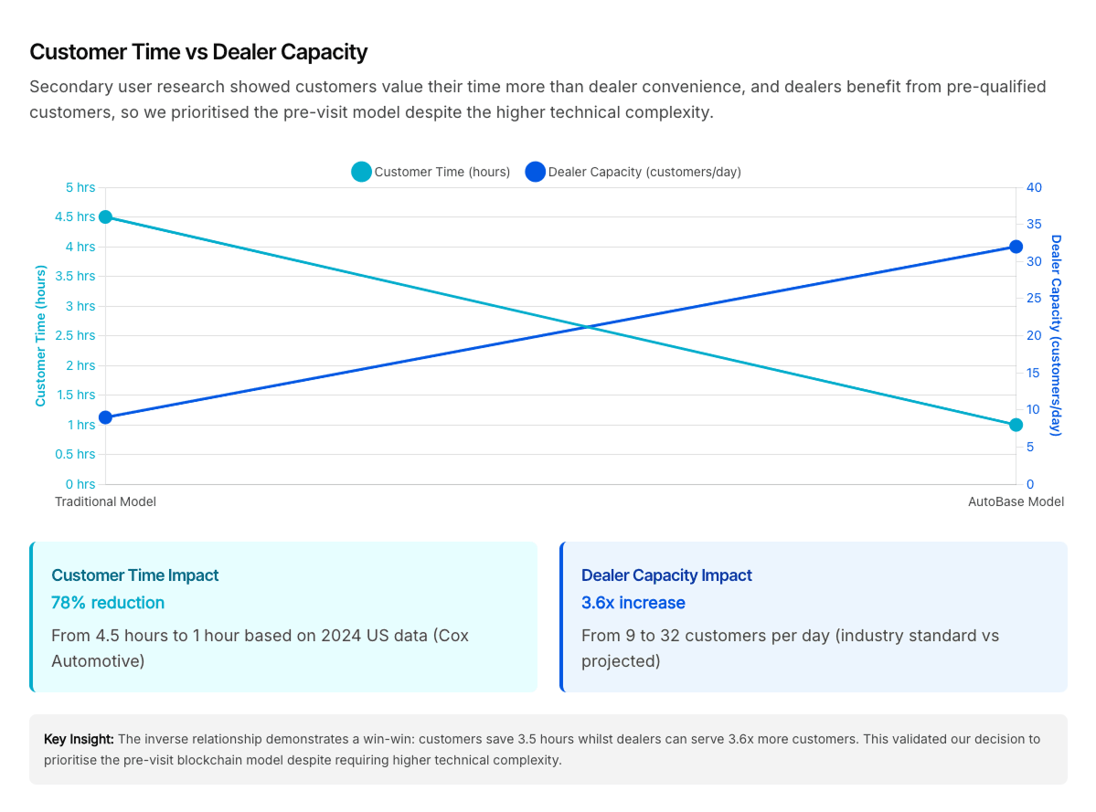 Secondary user research showed customers value their time more than dealer convenience, and dealers benefit from pre-qualified customers, so we prioritised the pre-visit model despite the higher technical complexity.