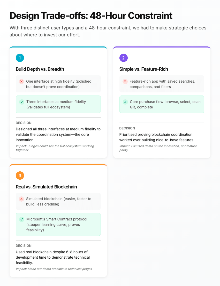 We prioritised proving the core blockchain coordination over building every feature, designing all three user interfaces at medium fidelity rather than one at high fidelity. This let judges see the full ecosystem working together, which was critical for demonstrating the value proposition.