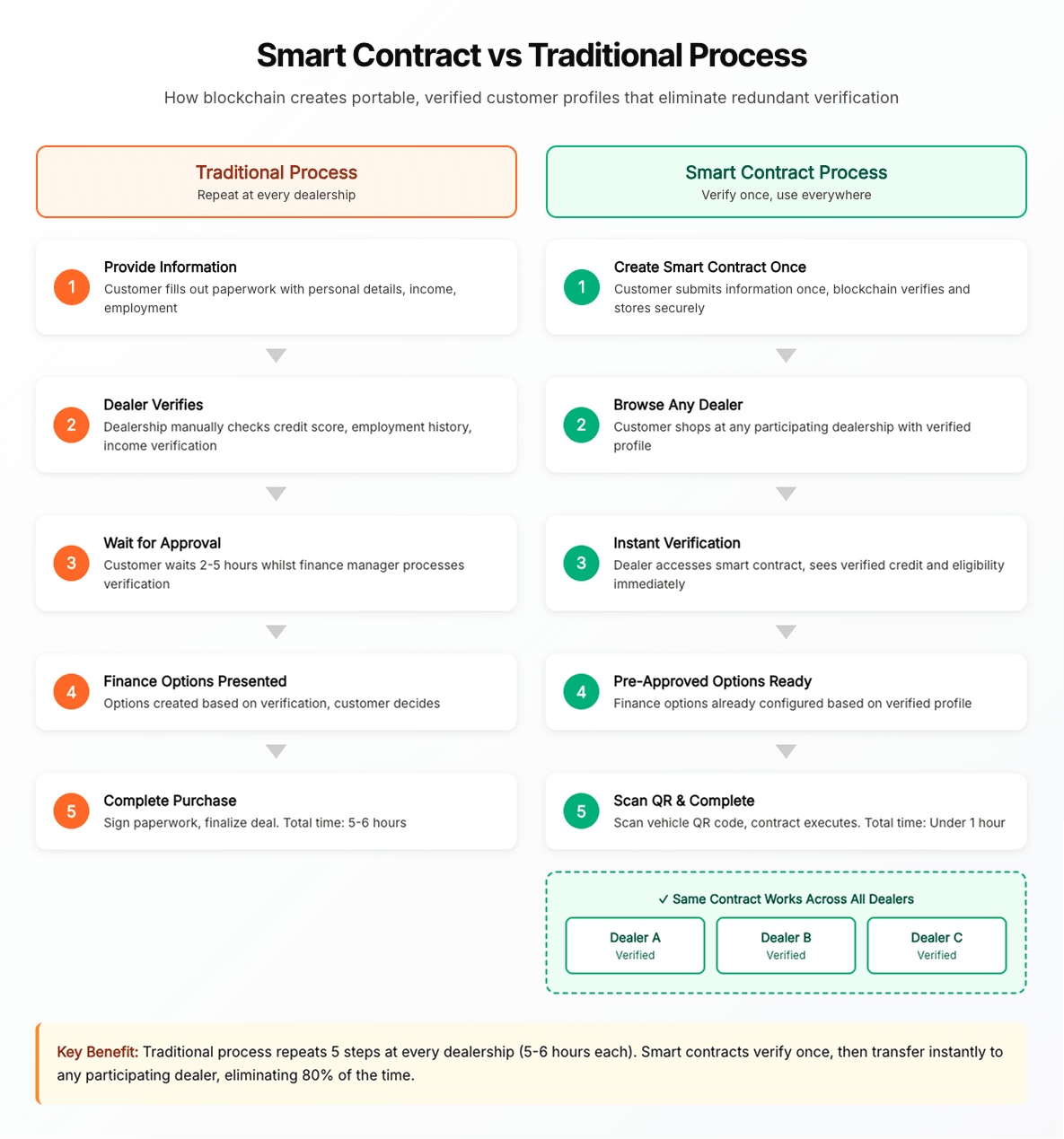 Blockchain creates a portable, verified record that travels with the customer, eliminating redundant data entry for customers and redundant verification for dealers. It’s not about the technology, it’s about transferring trusted data seamlessly between parties who don’t traditionally trust each other.