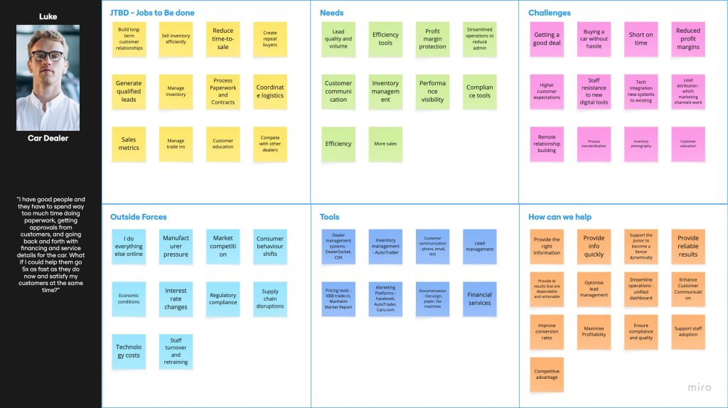 - Behaviours: Manages multiple dealerships, needs real-time visibility into transactions, wants to empower staff to work 5x faster