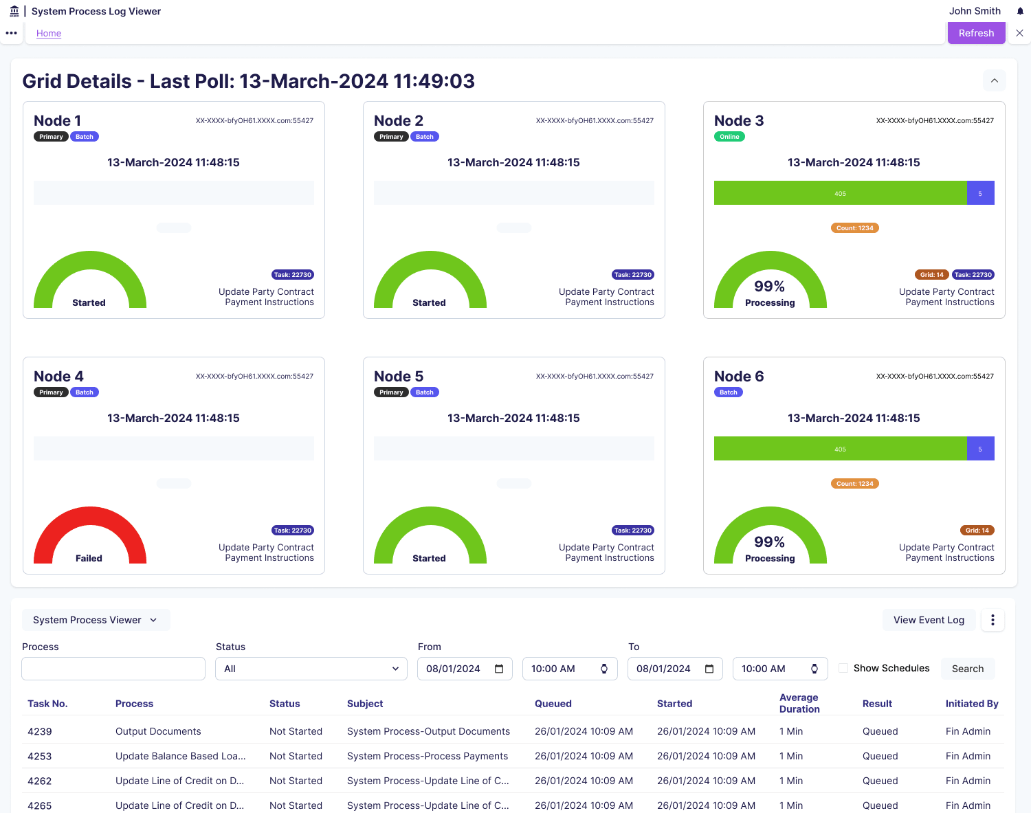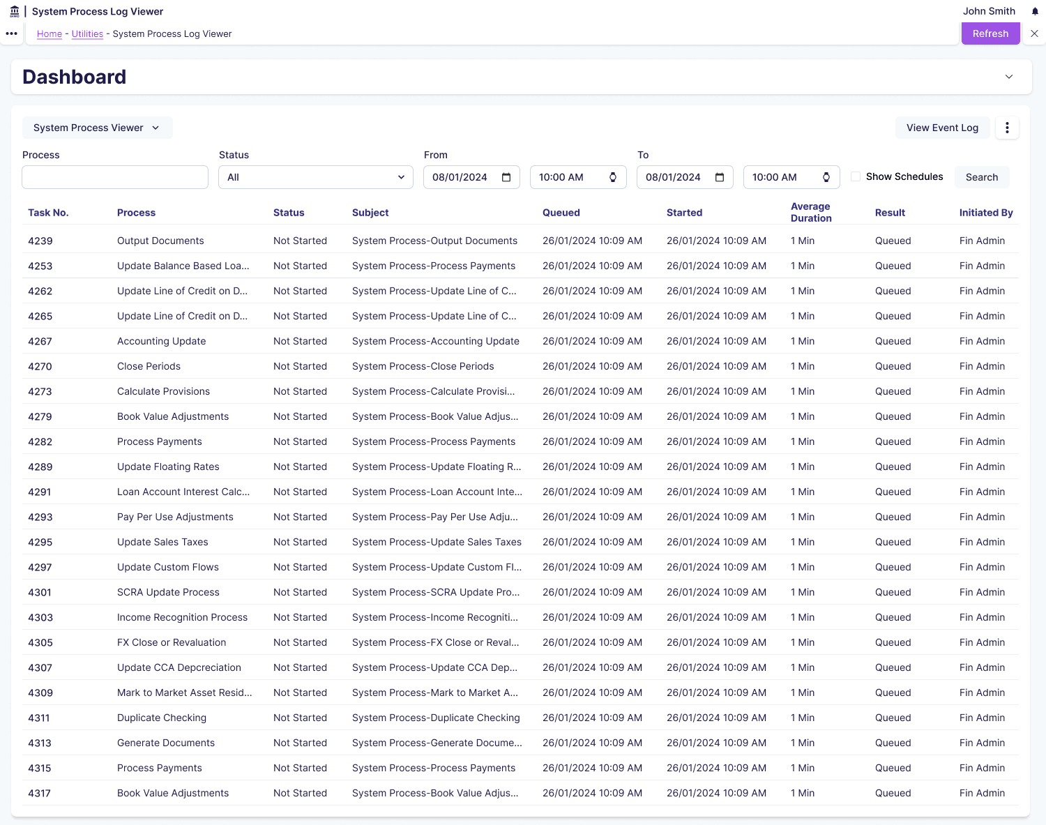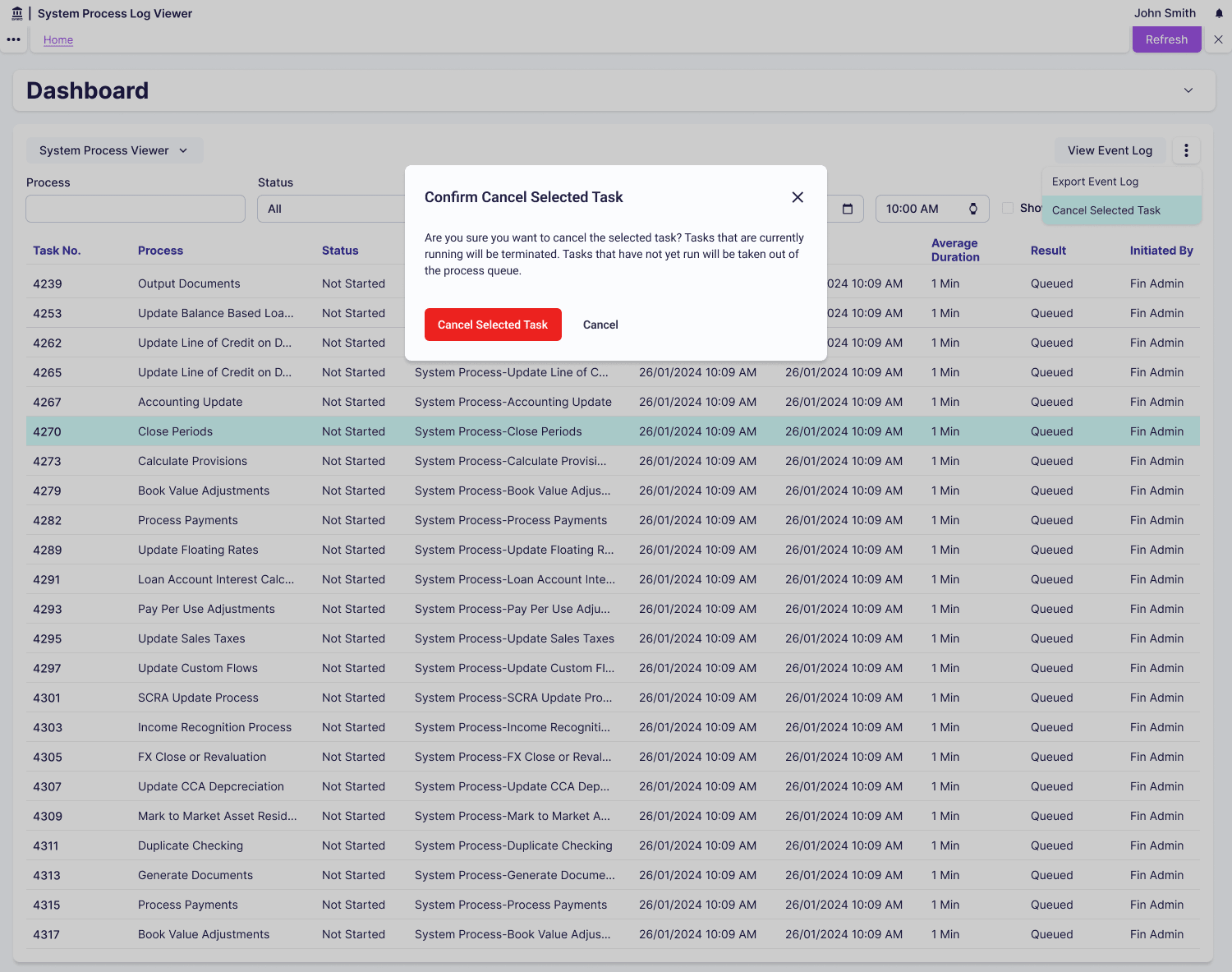 System administrators start their day by checking the System Process Viewer dashboard for any stuck or failed processes. When they identify issues through resource consumption charts showing flat lines (stuck processes), they drill into detailed logs to diagnose the root cause. They can cancel stuck processes to free resources and export filtered results to identify patterns over time, such as specific vendors consistently causing failures.