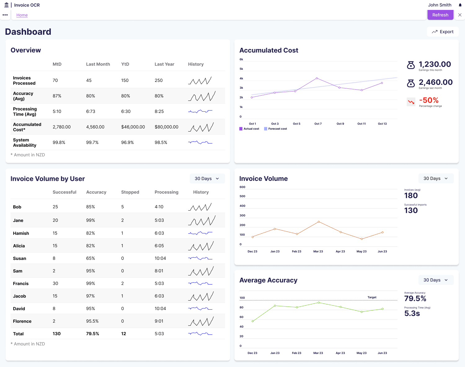 Oversees invoice processing operations and ensures system delivers value. Needs to verify the OCR delivers on the “faster than manual” promise, confirm processing speed meets SLA requirements, and identify when and why scans are slowing down. Requires simple health indicators without needing technical expertise.